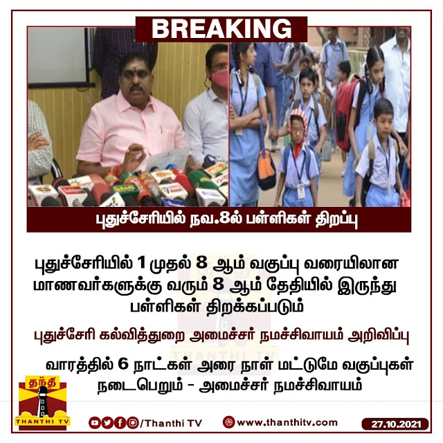 புதுச்சேரியில் நவம்பர் 8ஆம் தேதி பள்ளிகள் திறப்பு (Schools will open in Pondicherry on November 8)...